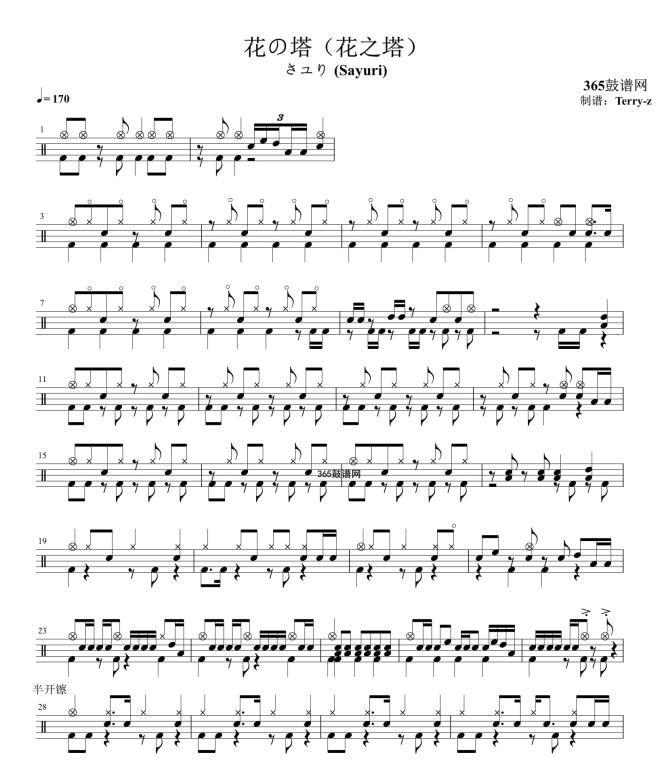 原创鼓谱 花の塔(花之塔) 鼓谱 架子鼓 高清鼓谱PDF