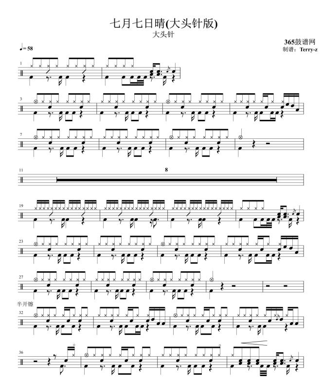 原创鼓谱 七月七日晴(大头针版) 鼓谱 架子鼓 高